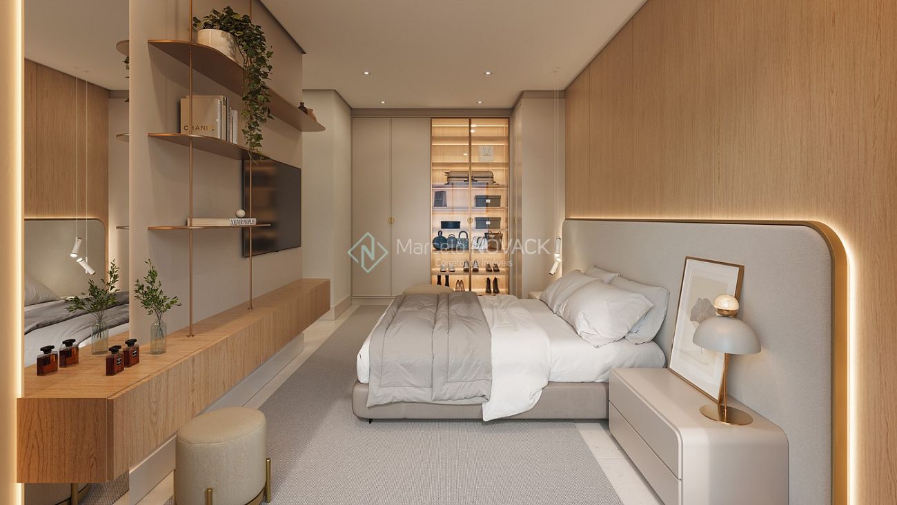 Espera p/ split, Rebaixo em gesso, Fechadura digital, Água quente, Sistemas de Câmeras, Espera p/ coifa, Manta acústica, Gerador de Energia, Espera p/ carregardor carro elétrico, Nicho nos banheiros, Janela peitoril em vidro, Porcelanato, Acesso por leitor facial, Ponto p/ máquina de lavar louças, etc.