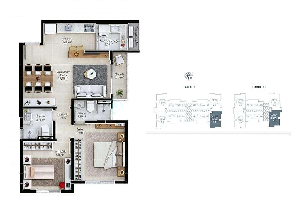 2 dormitórios (1 suíte)