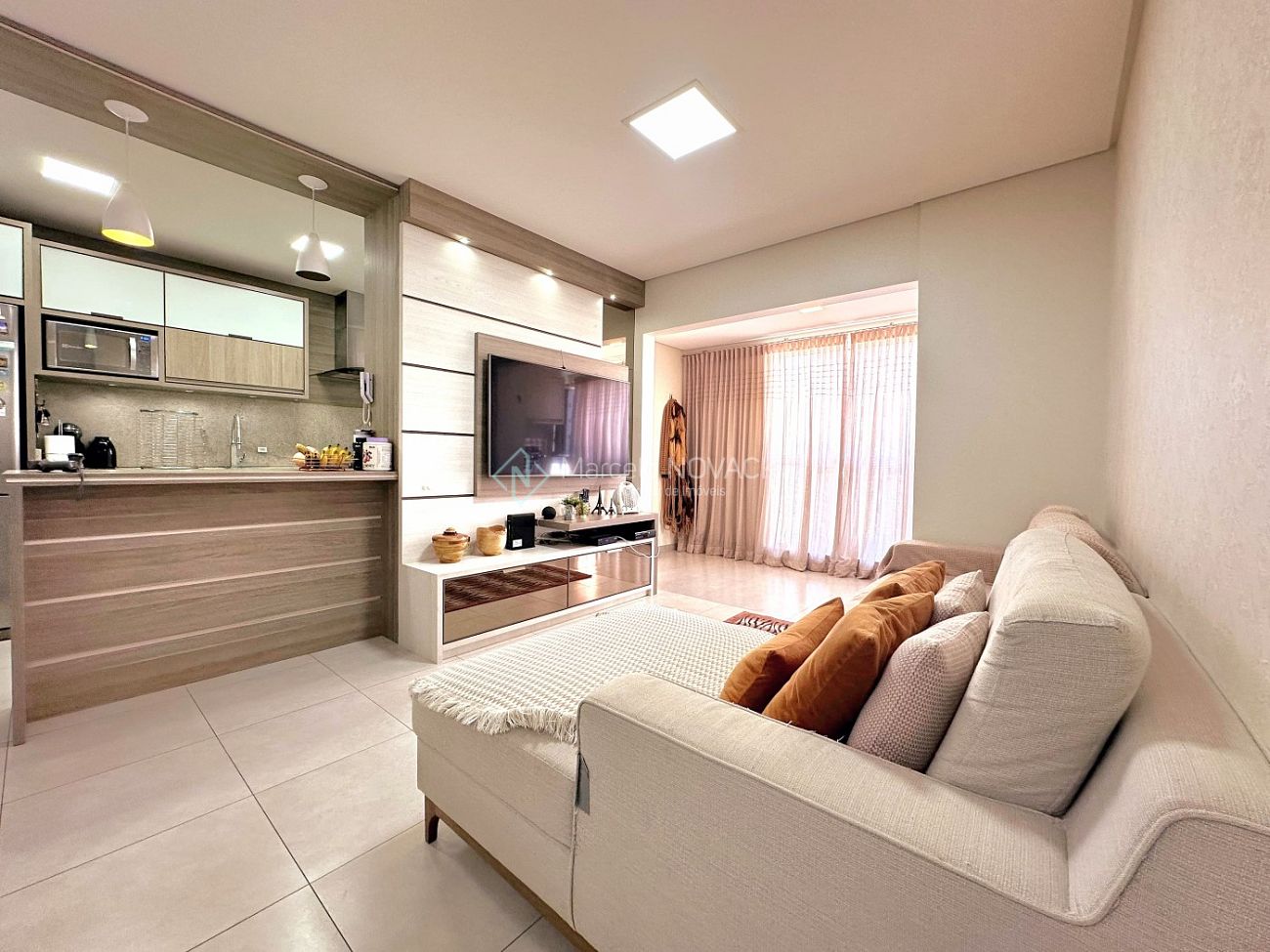 ✅ Sacada com churrasqueira a gás integrada com a sala