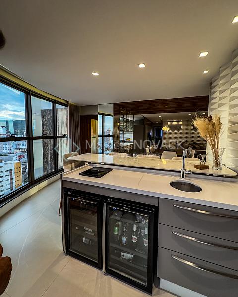 * sacada gourmet integrada com adega, cervejeira, fogão indução e churrasqueira a carvão