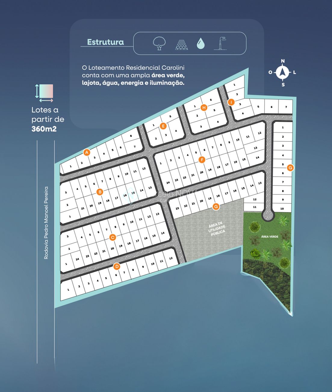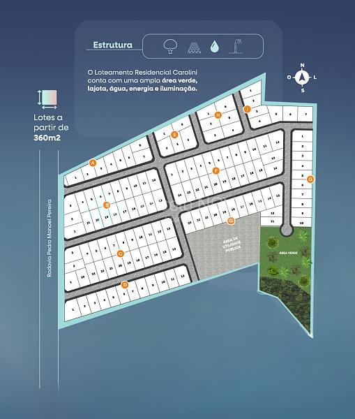 Com uma área de mais de 75 mil m², o loteamento Carolini conta com 130 lotes a partir de 360m².